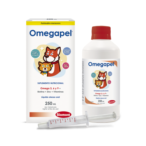 OMEGAPEL es un suplemento nutricional formulado a base de ácidos grasos esenciales, vitaminas, biotina y zinc, nutrientes específicos para mantener una piel saludable y un pelaje brillante y suave en perros y gatos. Indicado como coadyuvante en tratamientos por problemas de piel y pelo, como dermatitis atópica o alérgica por picaduras de pulgas, eczemas, piel seca o escamosa (seborrea), para el alivio de la picazón, pelo opaco o quebradizo. Controla la caída del pelo y la muda excesiva.