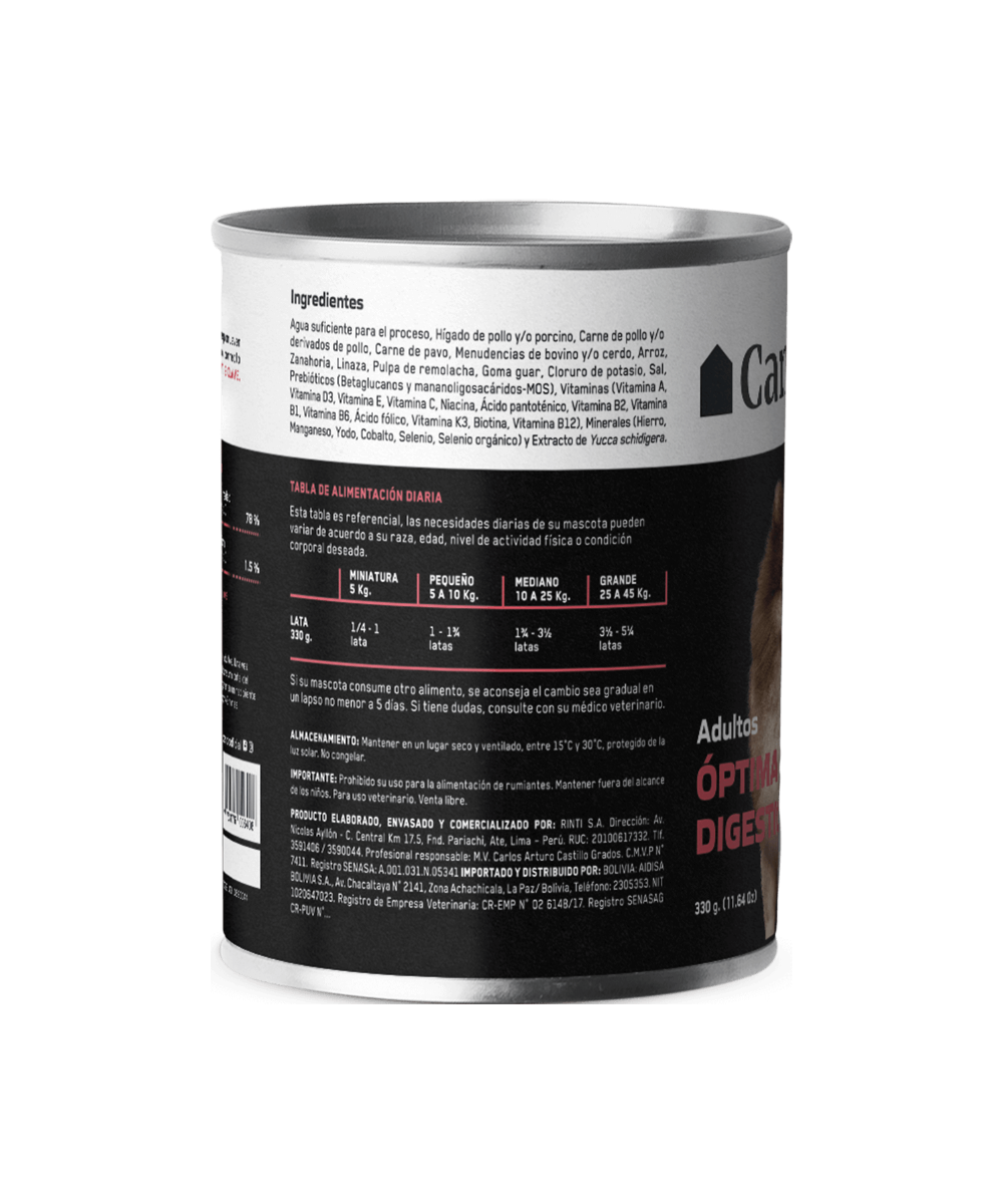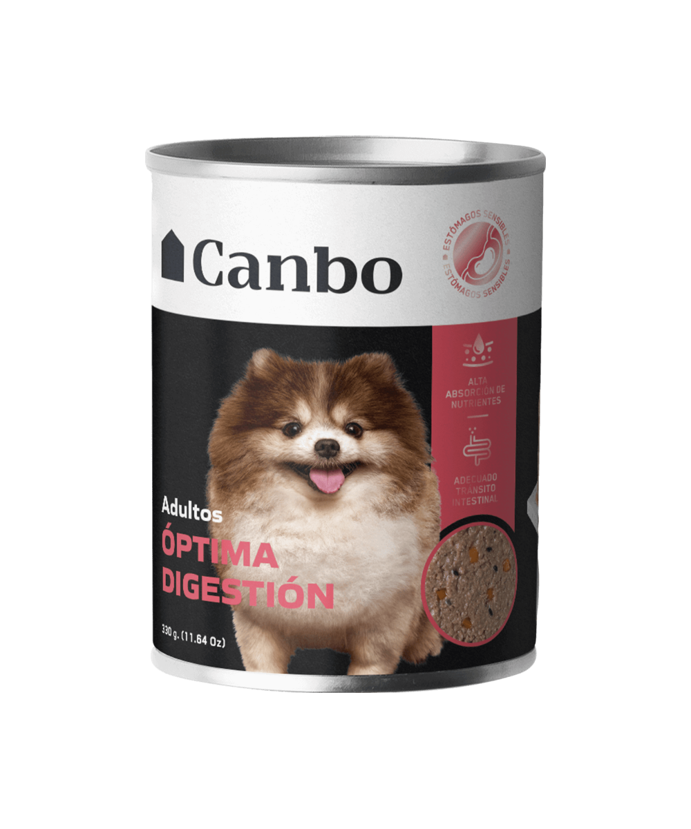 Este alimento perros adultos canbo digestion de 330gr está desarrollado con ingredientes altamente digestibles para minimizar el trabajo del sistema gastrointestinal. Por otra parte, su composición balanceada proporciona nutrición completa mientras protege el estómago y intestinos de perros sensibles.