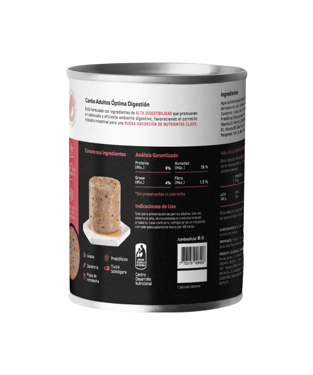 CANBO PATÉ OPTIMA DIGESTION para adultos todas las razas esta formulado con ingredientes de alta digestibilidad que promueven un adecuado y eficiente ambiente digestivo,favoreciendo el correcto transito intestinal para una buena absorción de nutrientes clave.