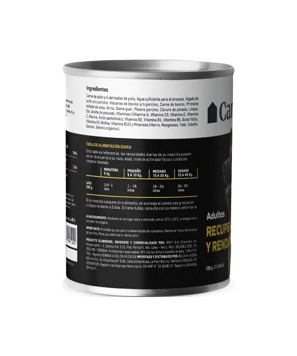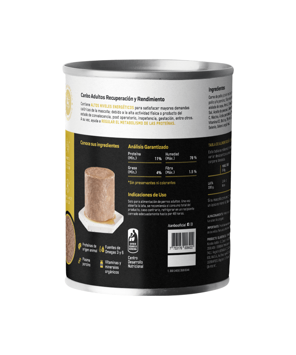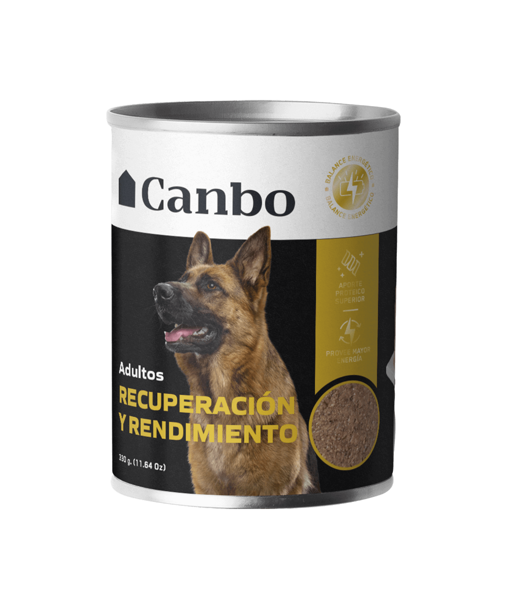 CANBO PATÉ RECUPERACIÓN Y RENDIMIENTO para adultos todas las razas contiene altos niveles energeticos para satisfacer mayores demandas calóricas de la mascota;debido a la alta actiividad fisica o producto del estado de convalecencia.