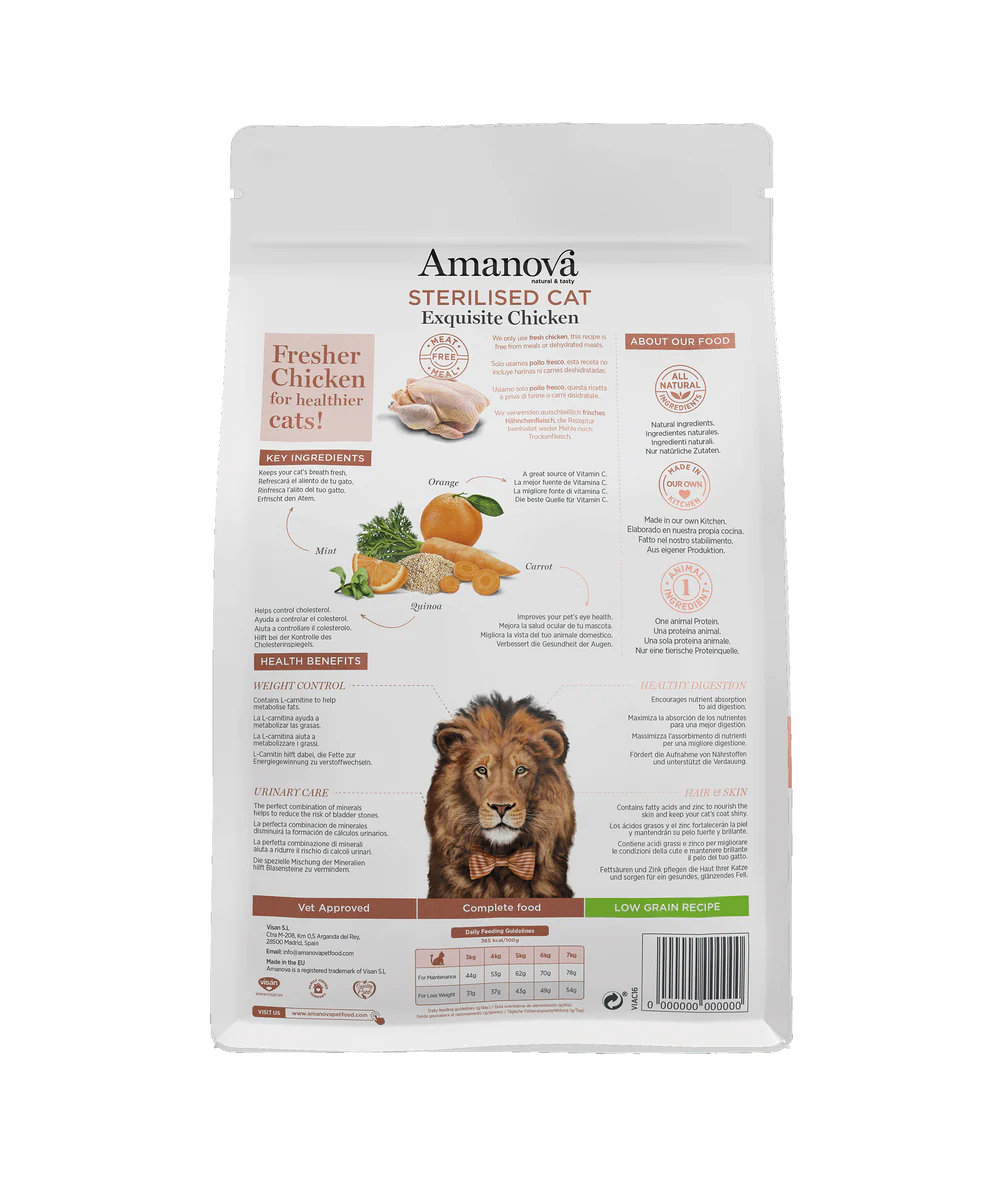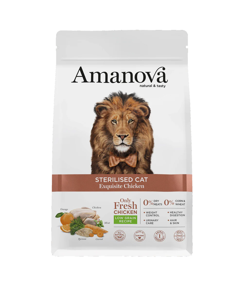 Amanova Sterilised Exquisite Chicken es una receta exclusiva de comida natural para gatos, sin harinas de carne ni carnes deshidratadas, contiene minerales, fibras dietéticas e ingredientes especiales como psyllium, probióticos, quinoa y aceite de pescado que ayudarán a mejorar la función renal, la digestión y a prevenir la formación de bolas de pelo.