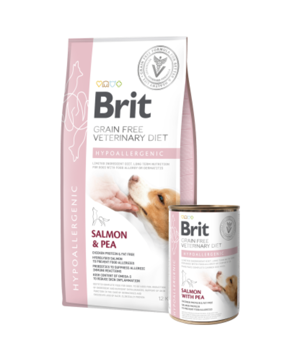 BRIT GF VET DIETS DOG HYPOALLERGENIC es un alimento balanceado hipoalergénico completo para perros con problemas dermatológicos y gastrointestinales causados por reacciones adversas al alimento (alergia al alimento/intolerancia al alimento).