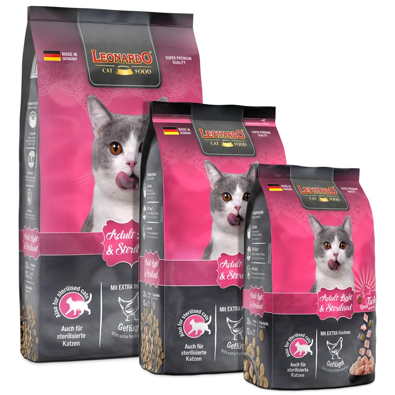 **LEONARDO® ADULT LIGHT & STERILISED **es para gatos adultos con sobrepeso .El exceso de peso puede deberse a muchas causas. Ya sea debido a una alimentación incorrecta por demasiadas golosinas o a la presencia de hormonas tras una castración, en ambos casos se reduce el nivel de actividad y aumenta enormemente el riesgo de padecer enfermedades. Por consiguiente, la adaptación temprana de la alimentación mediante un alimento para gatos de bajo contenido energético, como LEONARDO® Adult Light, promueve en gran medida la salud del animal y le ayuda a recuperar la forma.