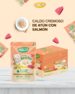 MOOCHIE CAT CREAMY BROTHS WITH TUNA & SALMÓN son sopas cremosas premium para gatos, diseñadas como alimento complementario húmedo de alta hidratación (90% contenido de humedad). Fabricados en Tailandia, estos caldos están hechos con ingredientes naturales, carne real, taurina y sin conservantes artificiales, ideales para mejorar la salud renal, urinaria y articular.