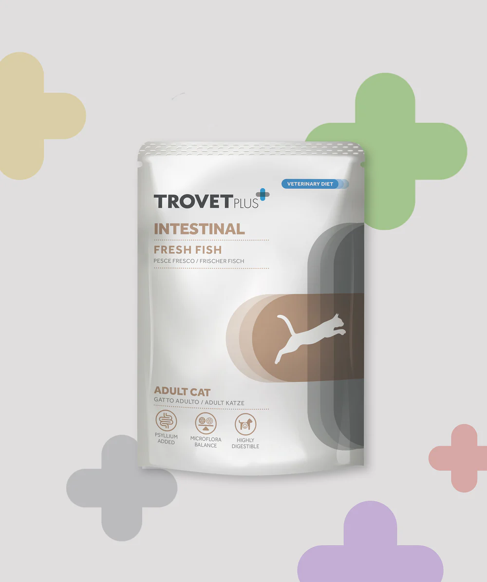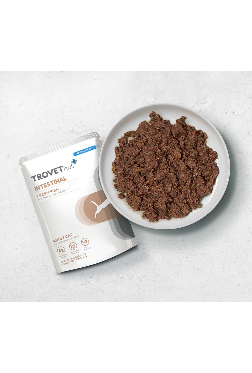 TROVET PLUS GATO AD INTESTINAL con pescado fresco es un alimento dietético completo para gatos adultos indicado para la compensación de las alteraciones de la digestión.
